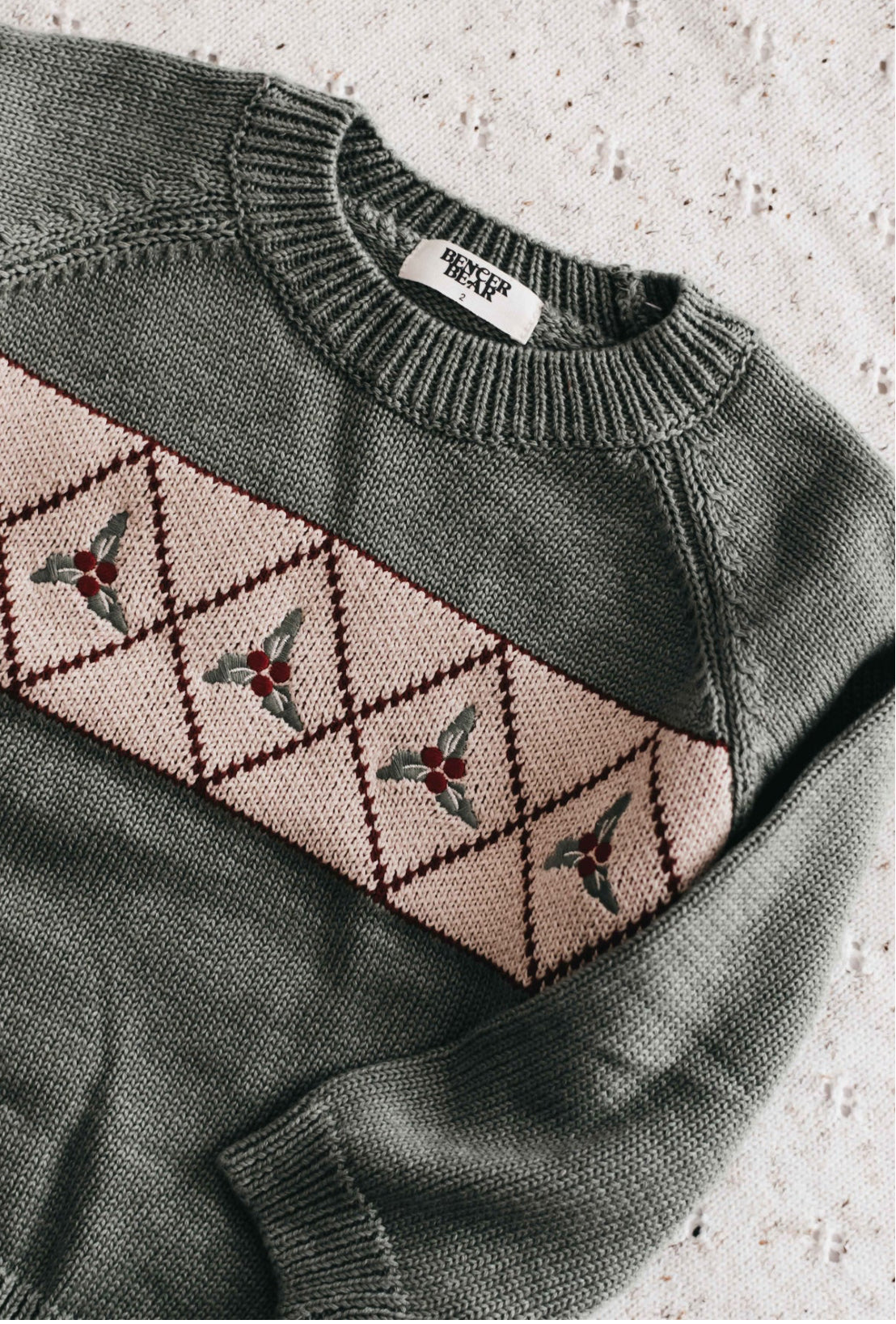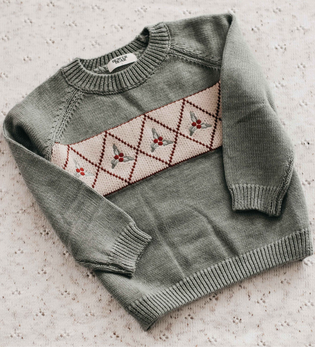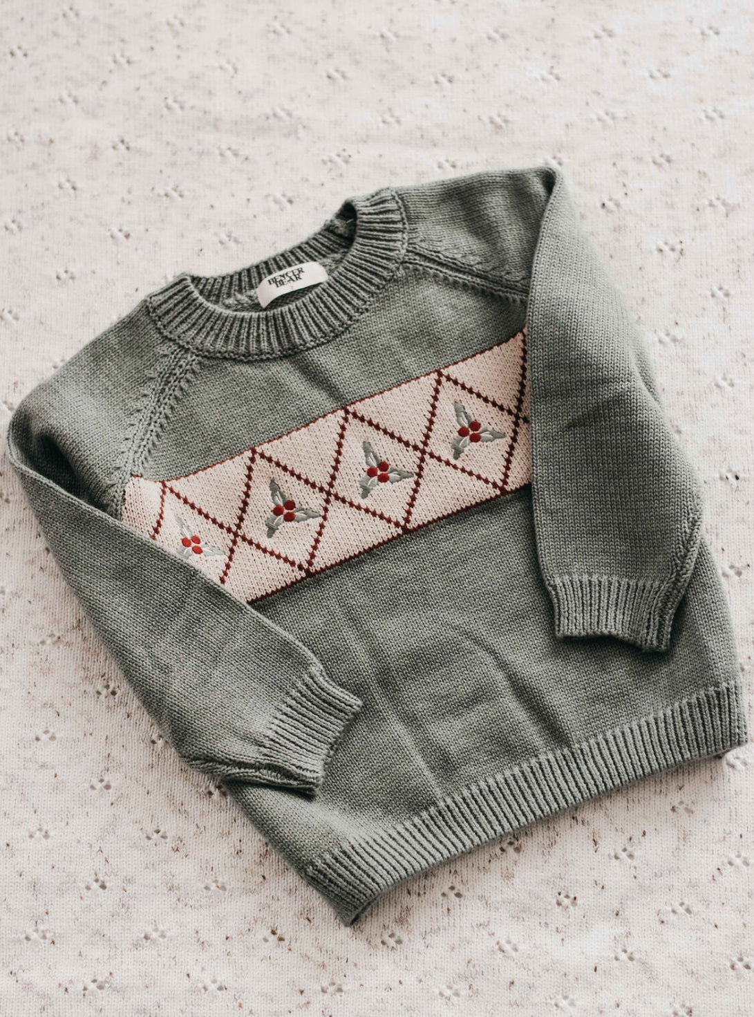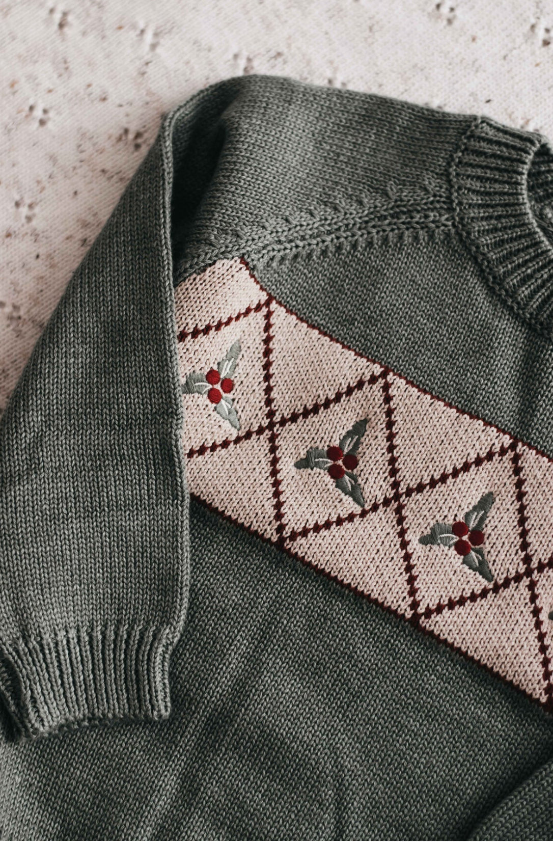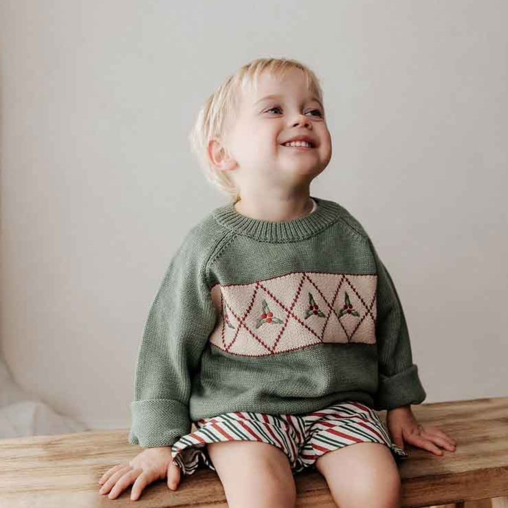 • Load image into Gallery viewer, Child sitting on a wooden stool wearing a green sweater with a patterned design.