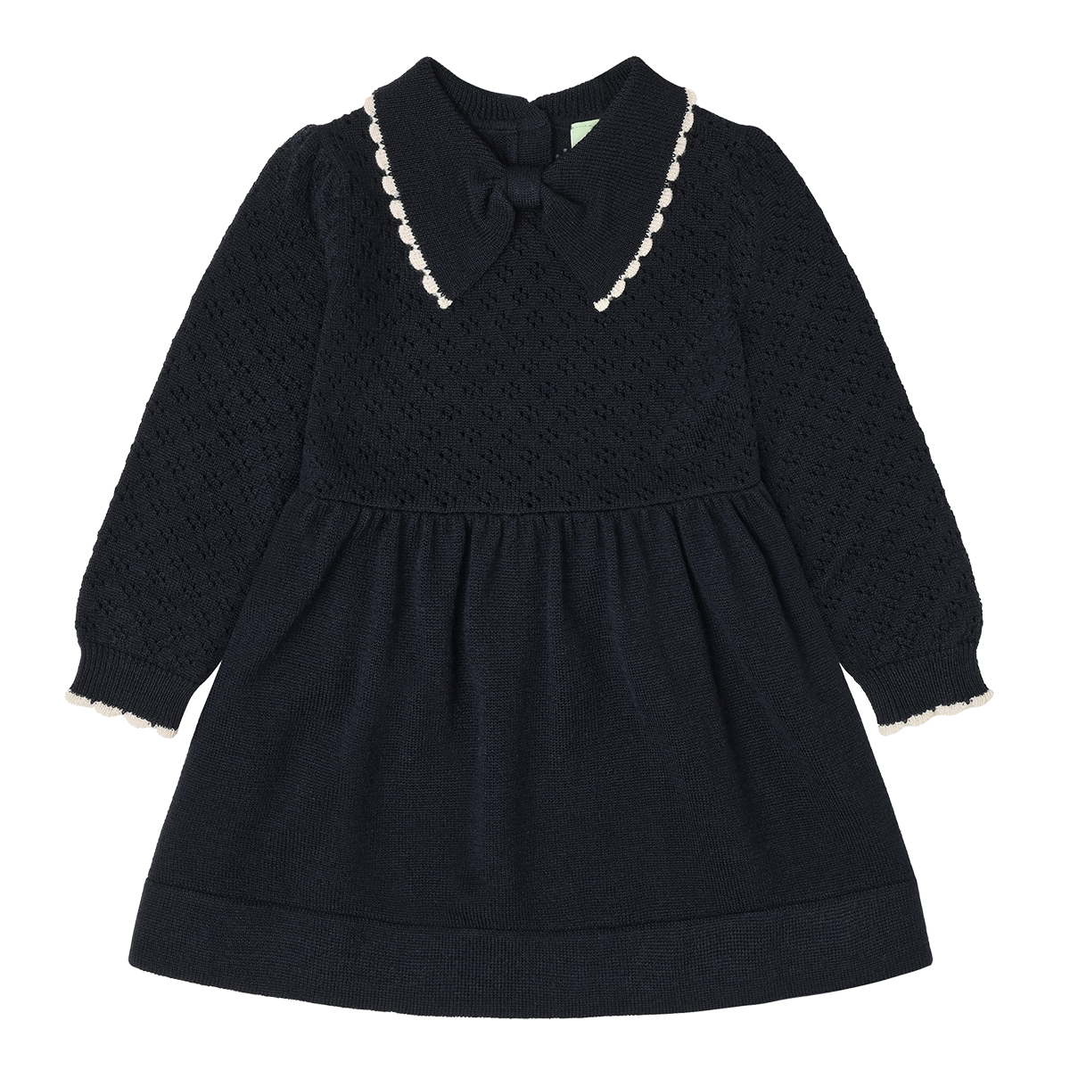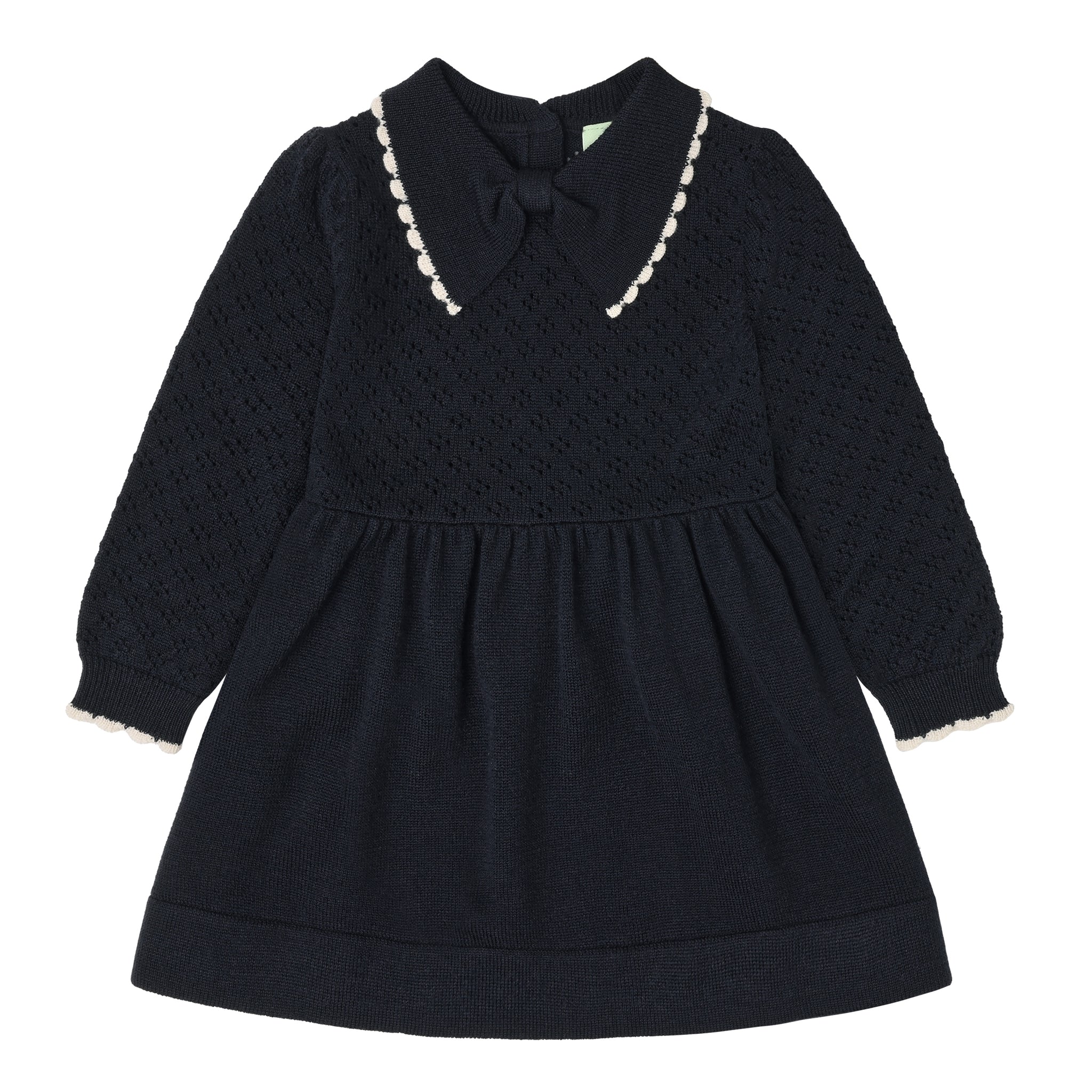 Made from pure merino wool, this baby dress features a decorative bow collar, long sleeves, rib trims, and a button closure at the back with pearl shell buttons. The collar and sleeve hems have a narrow contrast colour lace edge. Soft gatherings at the waist add volume to the skirt. The top of the dress is knitted in a delicate pointelle structure, while the skirt is made from a drapey single jersey. The wool is BLUESIGN® and RWS certified, free from harmful chemicals, and sourced from non-mulesed sheep.