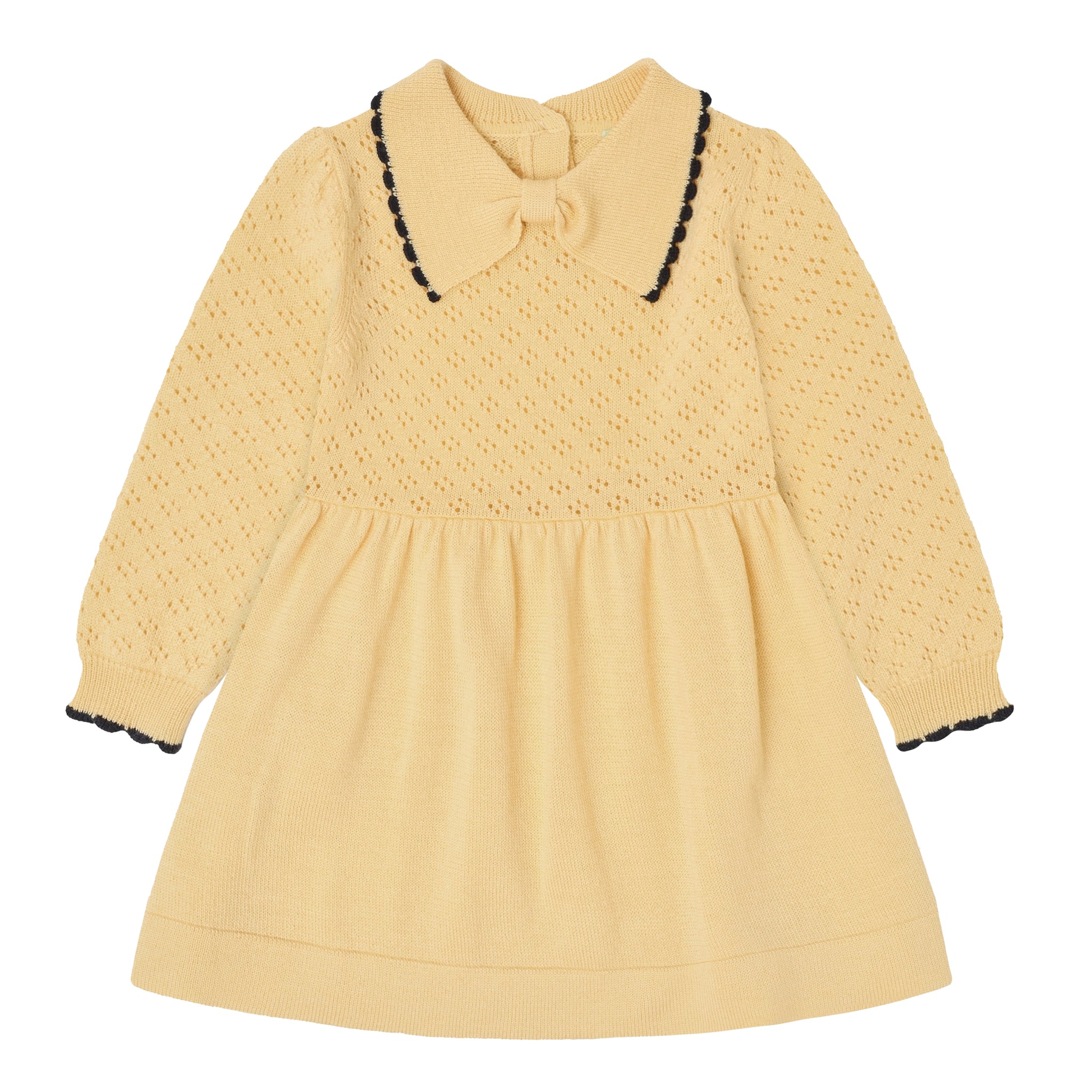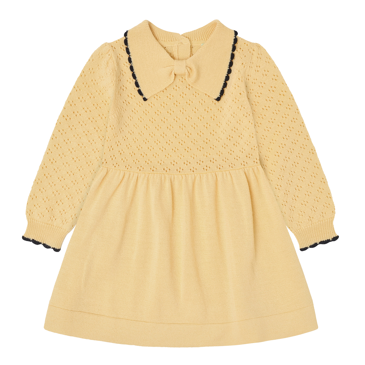 Made from pure merino wool, this baby dress features a decorative bow collar, long sleeves, rib trims, and a button closure at the back with pearl shell buttons. The collar and sleeve hems have a narrow contrast colour lace edge. Soft gatherings at the waist add volume to the skirt. The top of the dress is knitted in a delicate pointelle structure, while the skirt is made from a drapey single jersey. The wool is BLUESIGN® and RWS certified, free from harmful chemicals, and sourced from non-mulesed sheep.