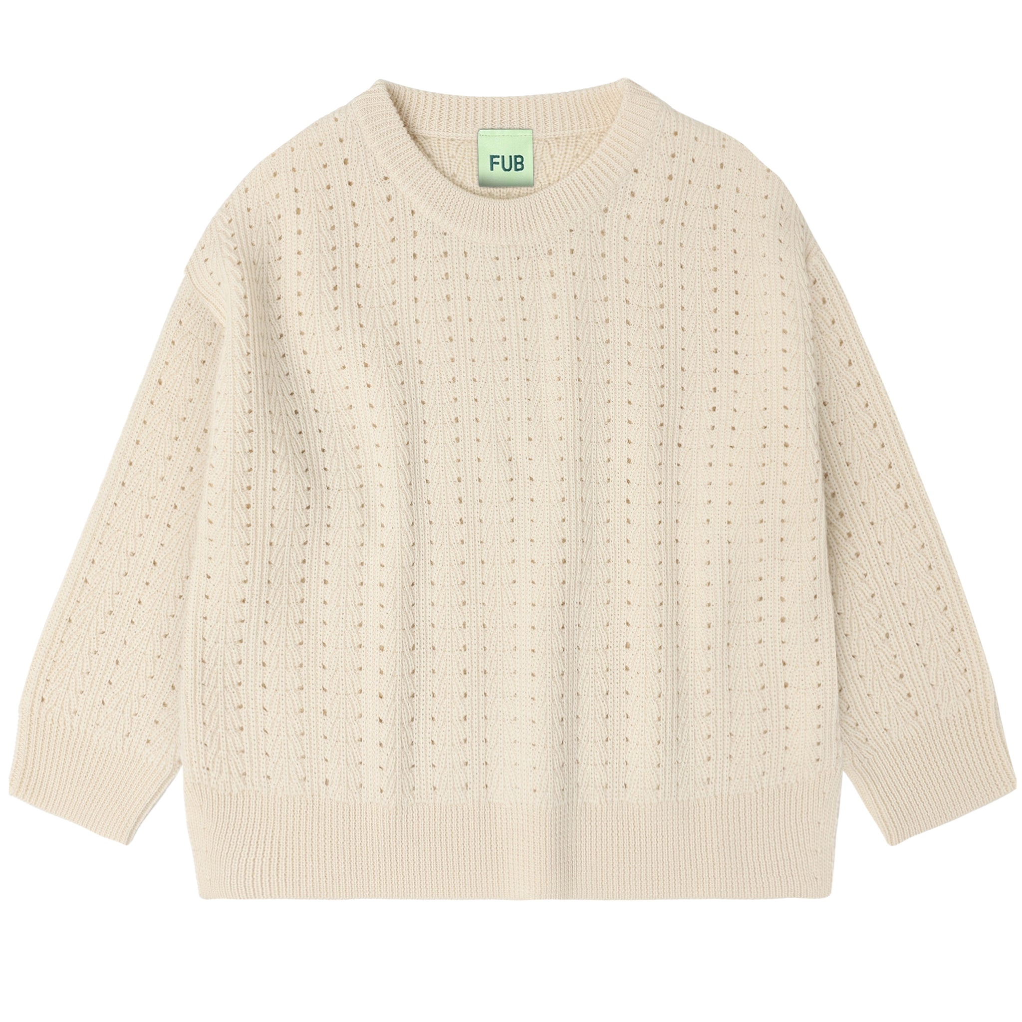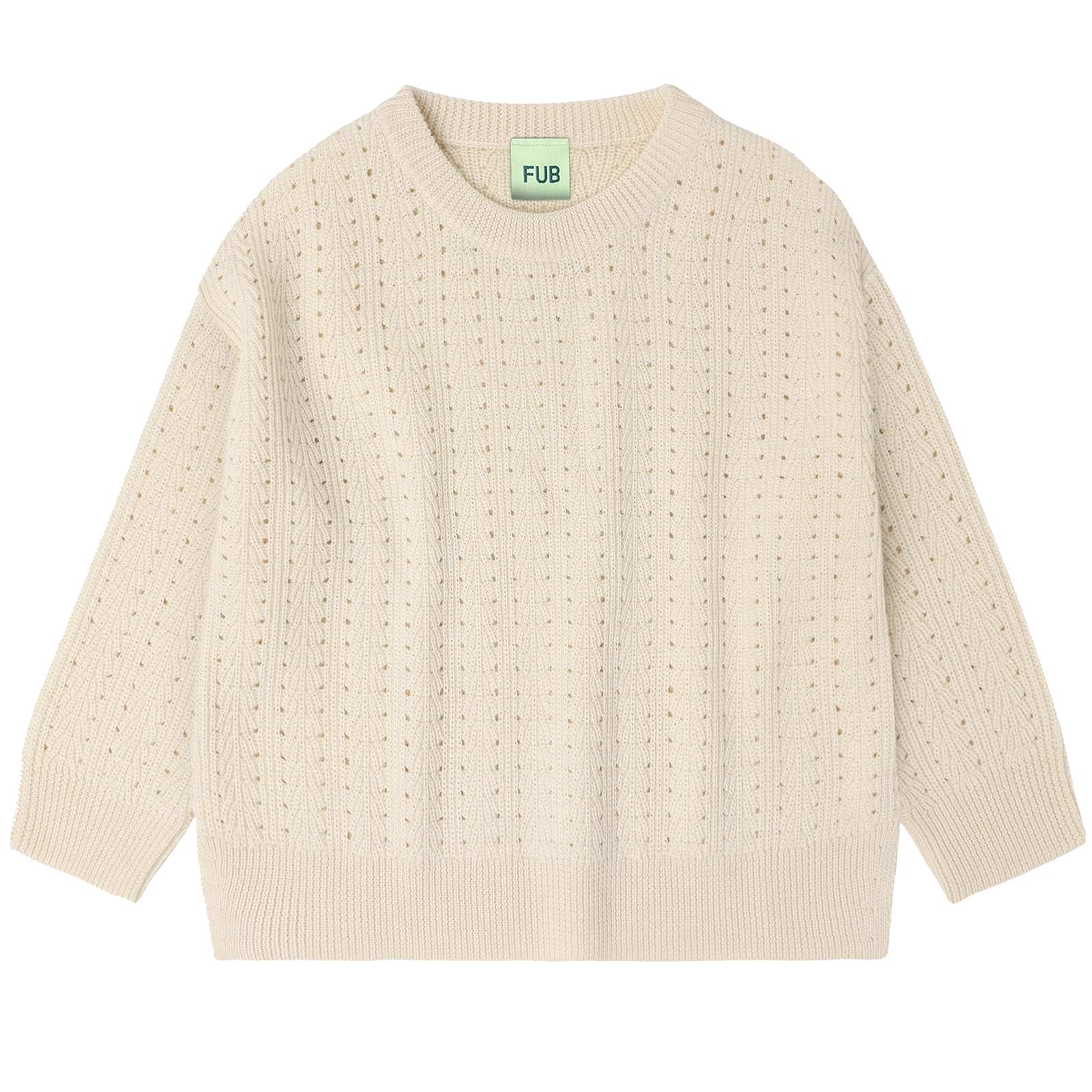 Made from pure merino wool, this sweater features a round ribbed collar, ribbed hems, and a relaxed fit. It is knitted in a decorative pointelle structure. The merino wool is BLUESIGN® and RWS certified, free from harmful chemicals, and sourced from non-mulesed sheep.