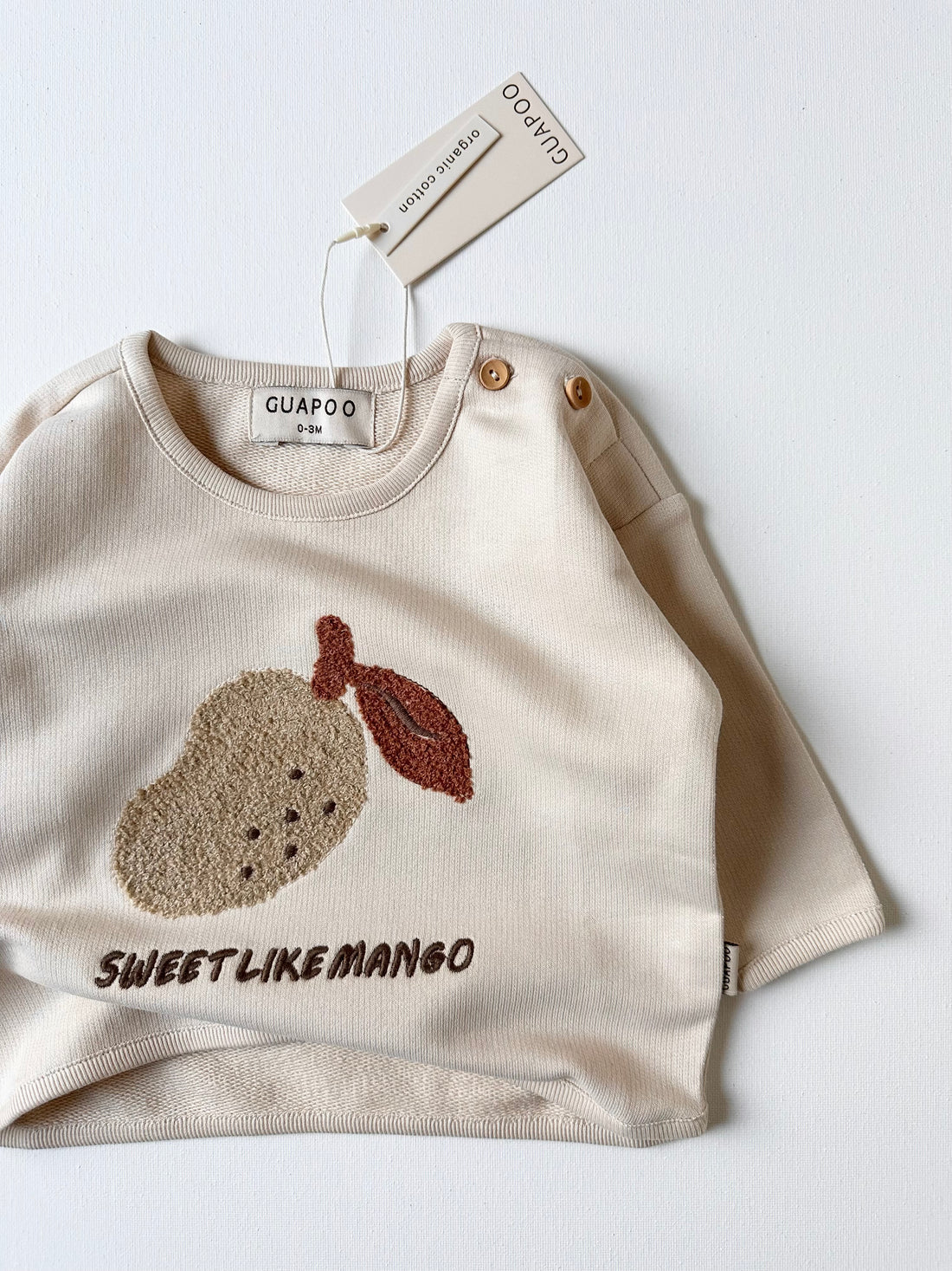 Super soft terrycloth T-shirt for children, oversized cut with the slogan "SWEAT LIKE MANGO". Features a trendy button placket for easy dressing and undressing.