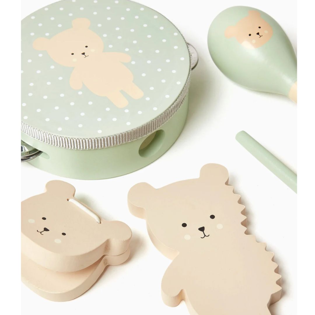 All the instruments are designed with a soft, natural and sage colour theme and Teddy's charming face, making them even more fun to play with. Featuring a tambourine, maracas and a castanet, perfect for stimulating children's interest in music, coordination, and rhythm from an early age!