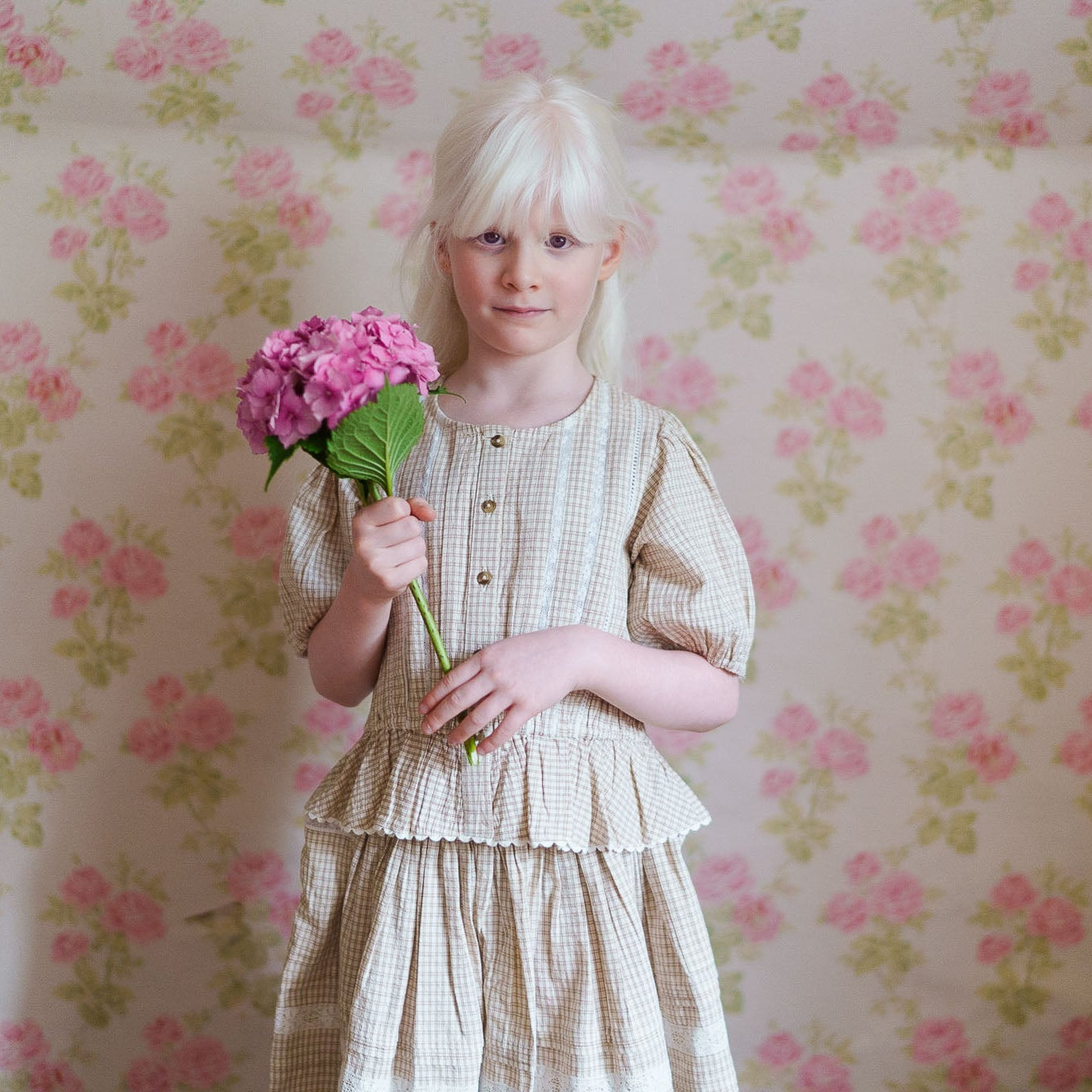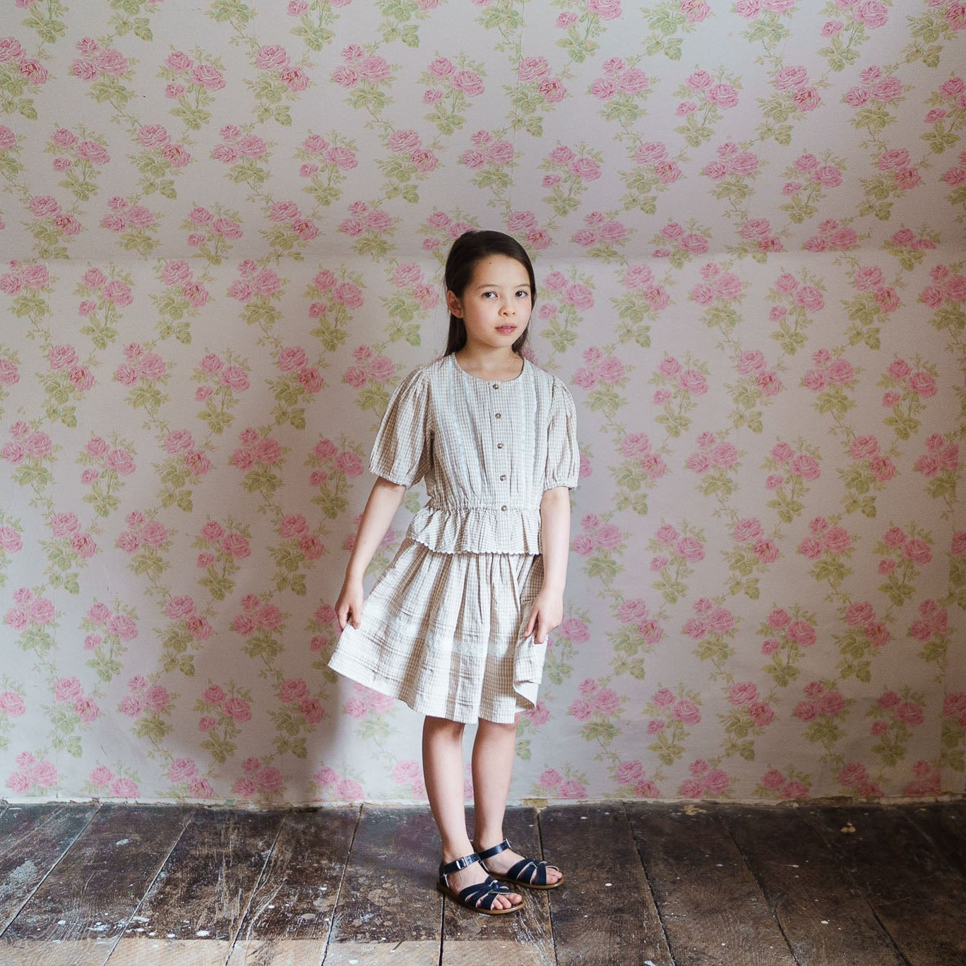 A lovely, simple skirt, perfect for everyday paired with our blouses or organic pointelle t-shirts. Made from a soft woven cotton check with floral cotton-lace trim to the hem, waist and the tops of the patch pockets. This skirt is very full and has an elasticated back waist.