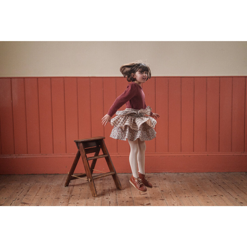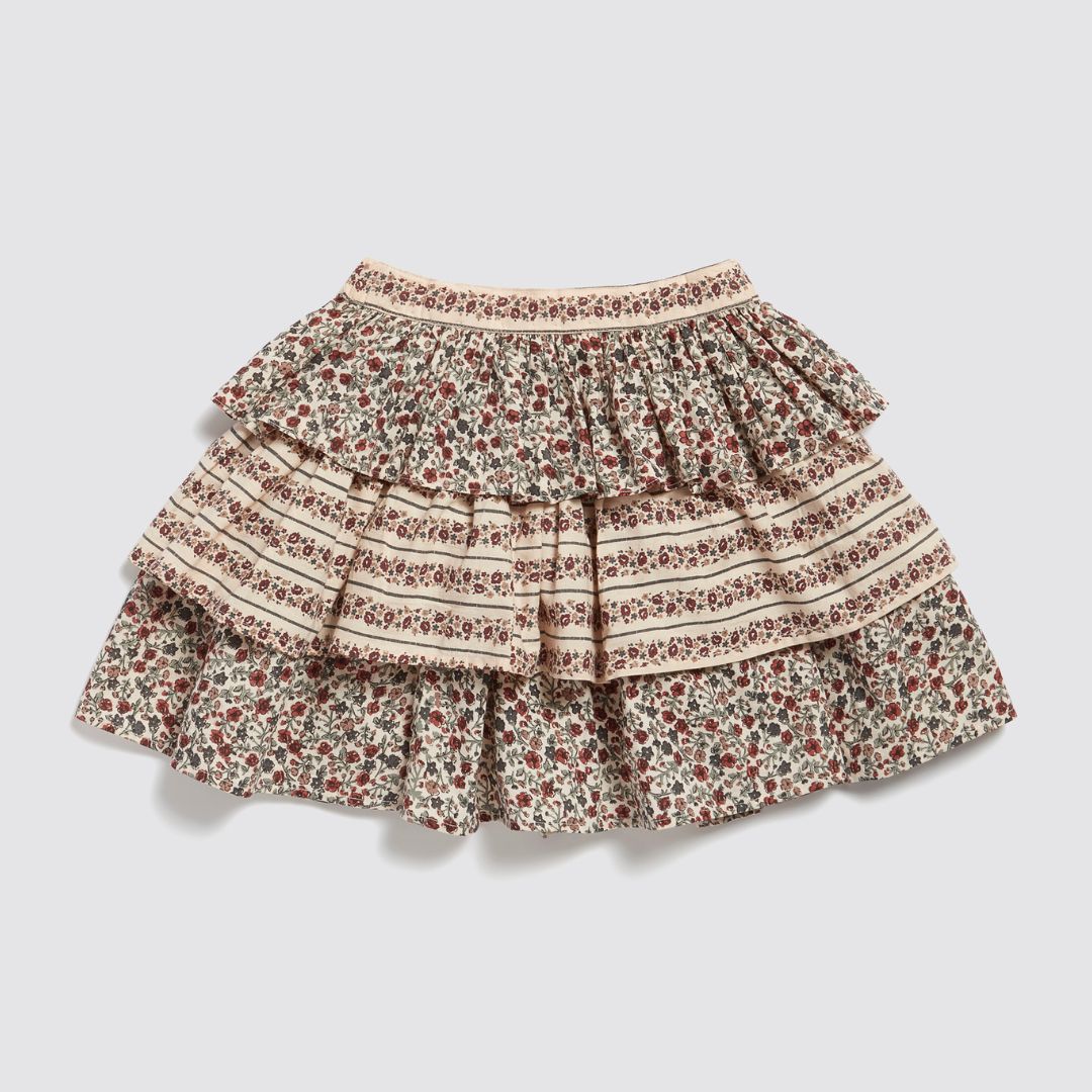 A lovely, full, ra-ra skirt, perfect for everyday or dressing up for parties. Looks great paired with our blouses or organic, jersey, pointelle t-shirts. Made from contrasting tiers of our organic floral fabrics. This skirt has an elasticated back waist.