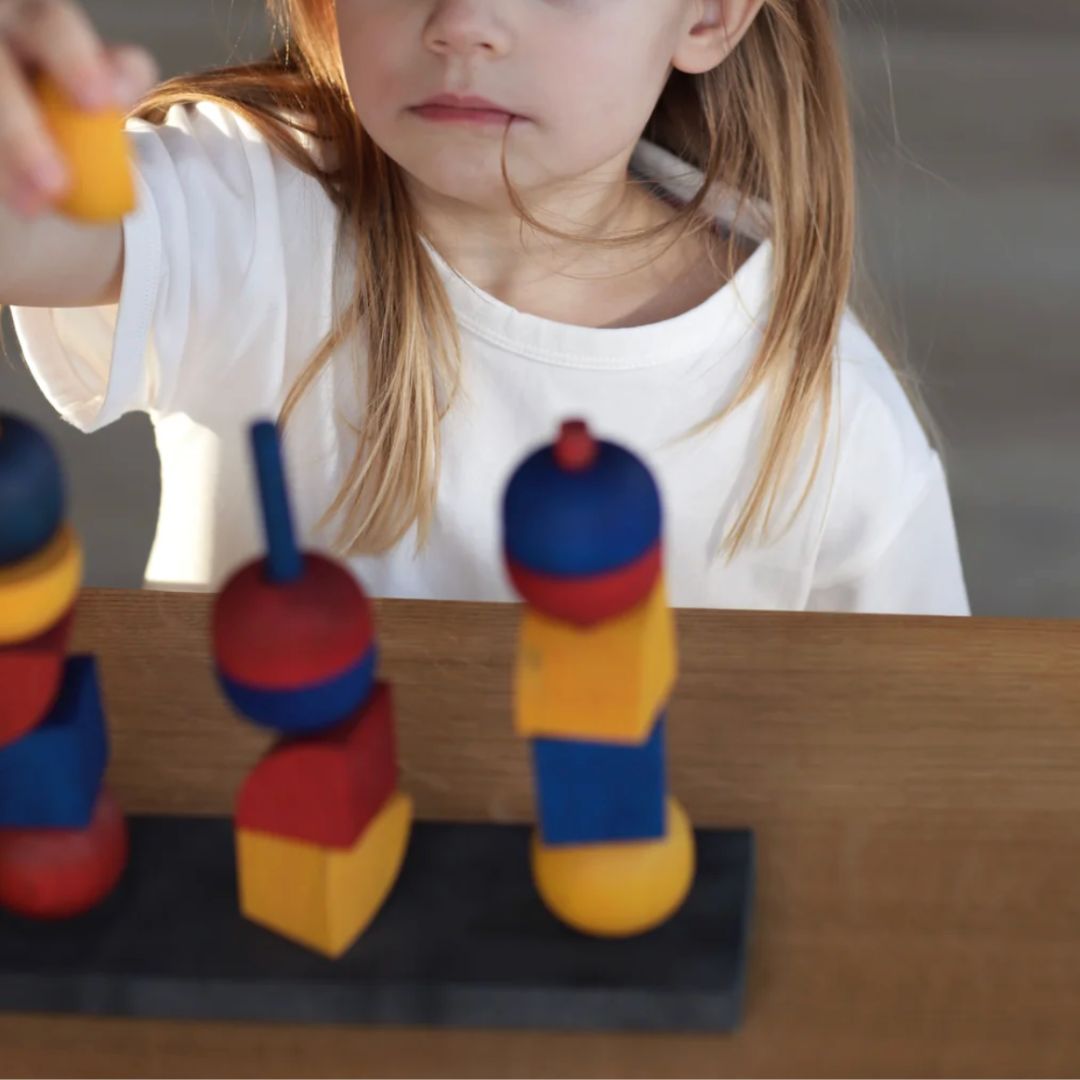 Stacking the elements helps develop logical thinking and concentration, enhances fine motor skills and hand-eye coordination. The child creates their own compositions, learning creative thinking, while interacting with Bauhaus-inspired forms nurtures a sense of aesthetics and creativity.