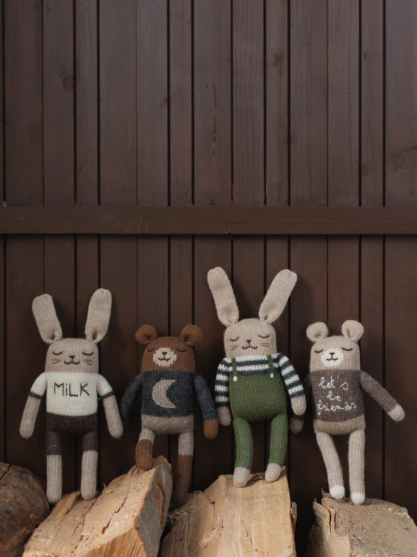 This one of a kind soft knitted bunny, dressed in a classic let's be friends is the perfect companion for your little one. A special addition to the Organic Zoo toy family, brought to you in collaboration with Main Sauvage.