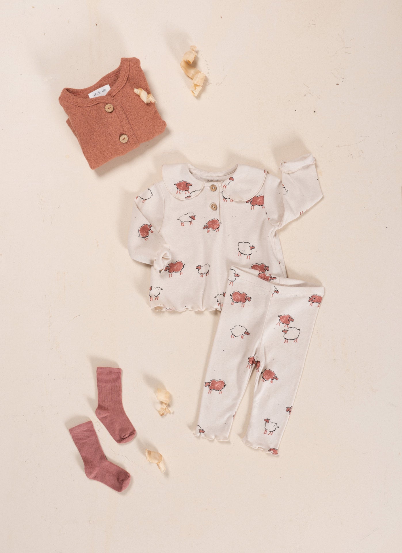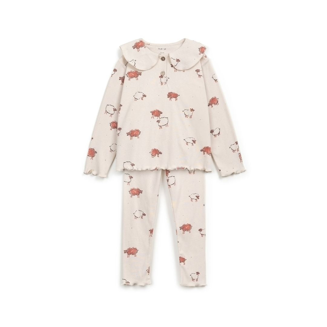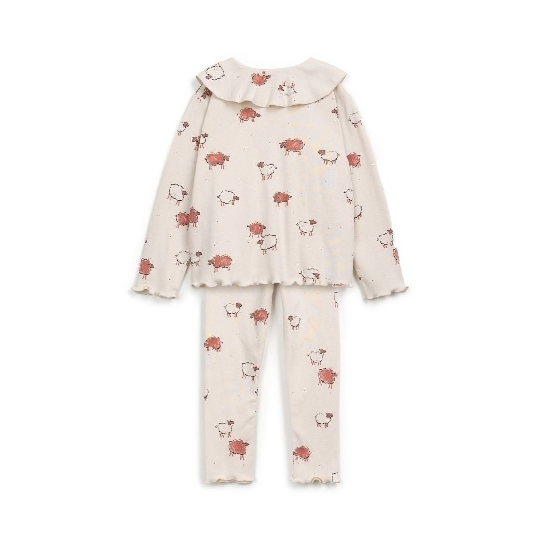 These jersey pajamas are made from a mixture of organic cotton and recycled cotton, So-So color, with our sheep print. The t-shirt is a long-sleeve model with a round neckline, has a front opening with coconut buttons and a collar. The pants have an elastic waist and rolled finish.