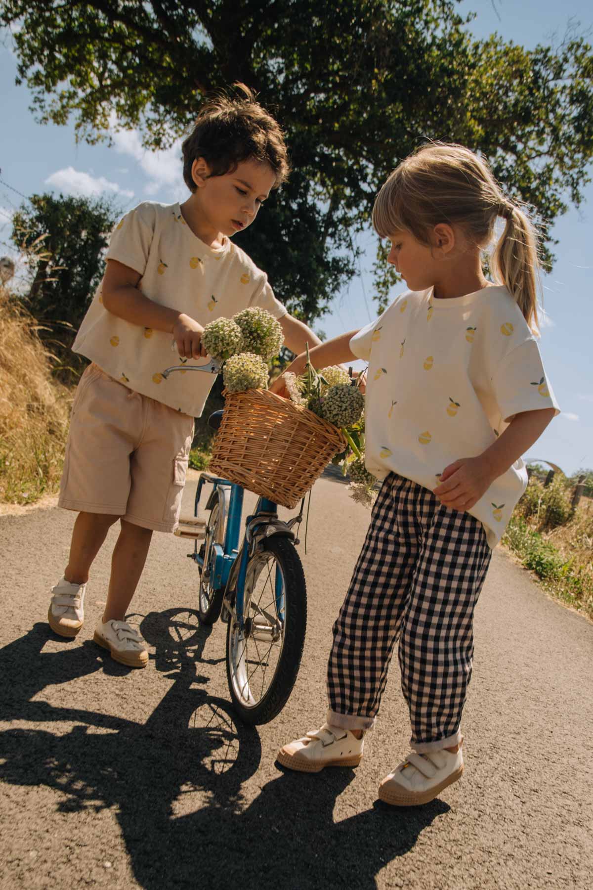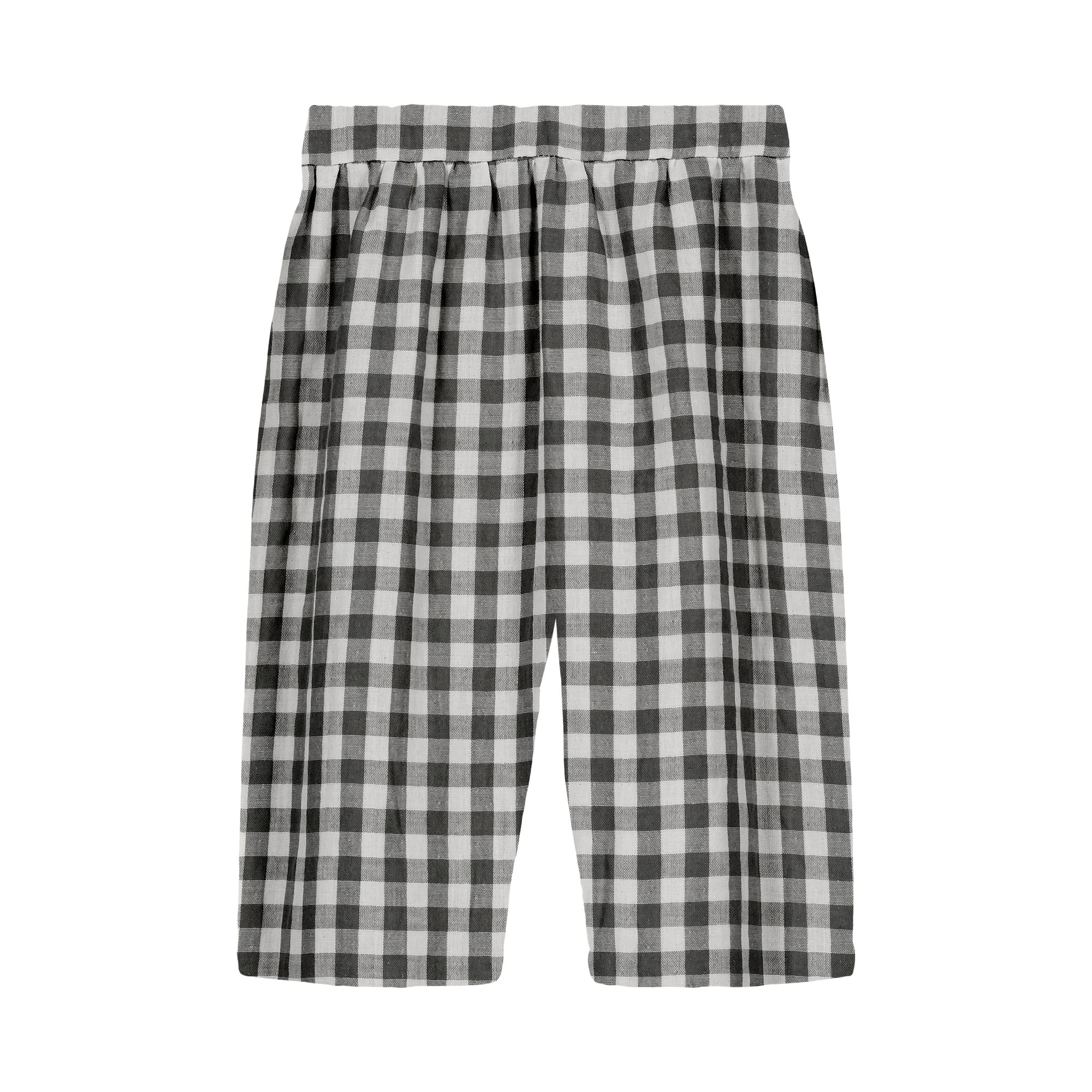 Comfortable unisex wide trousers in organic crumpled cotton gauze.