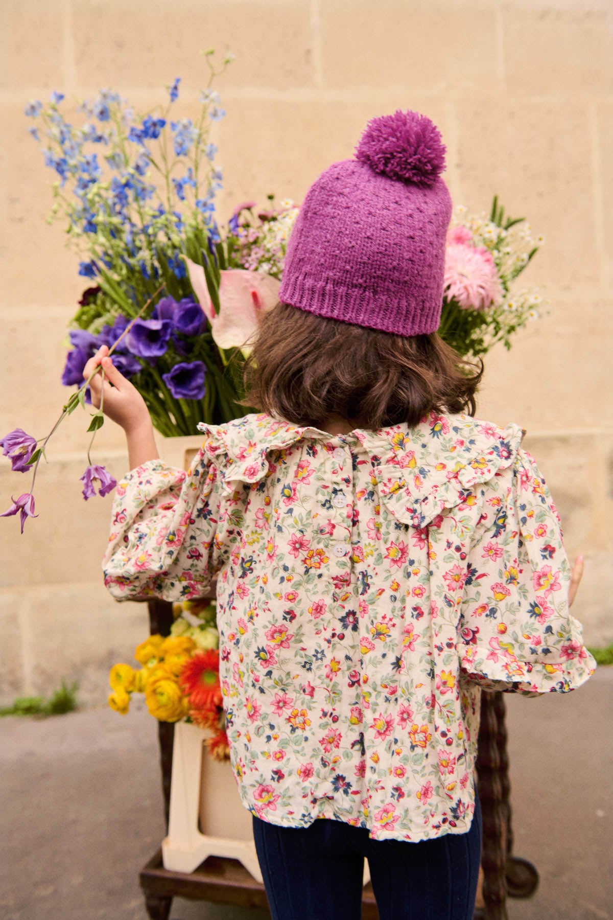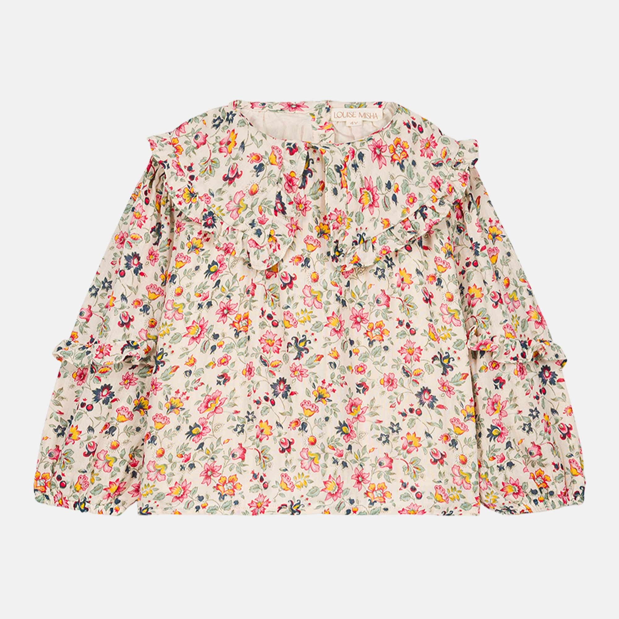 •Puffed sleeves with ruffled details and elasticized cuffs.
