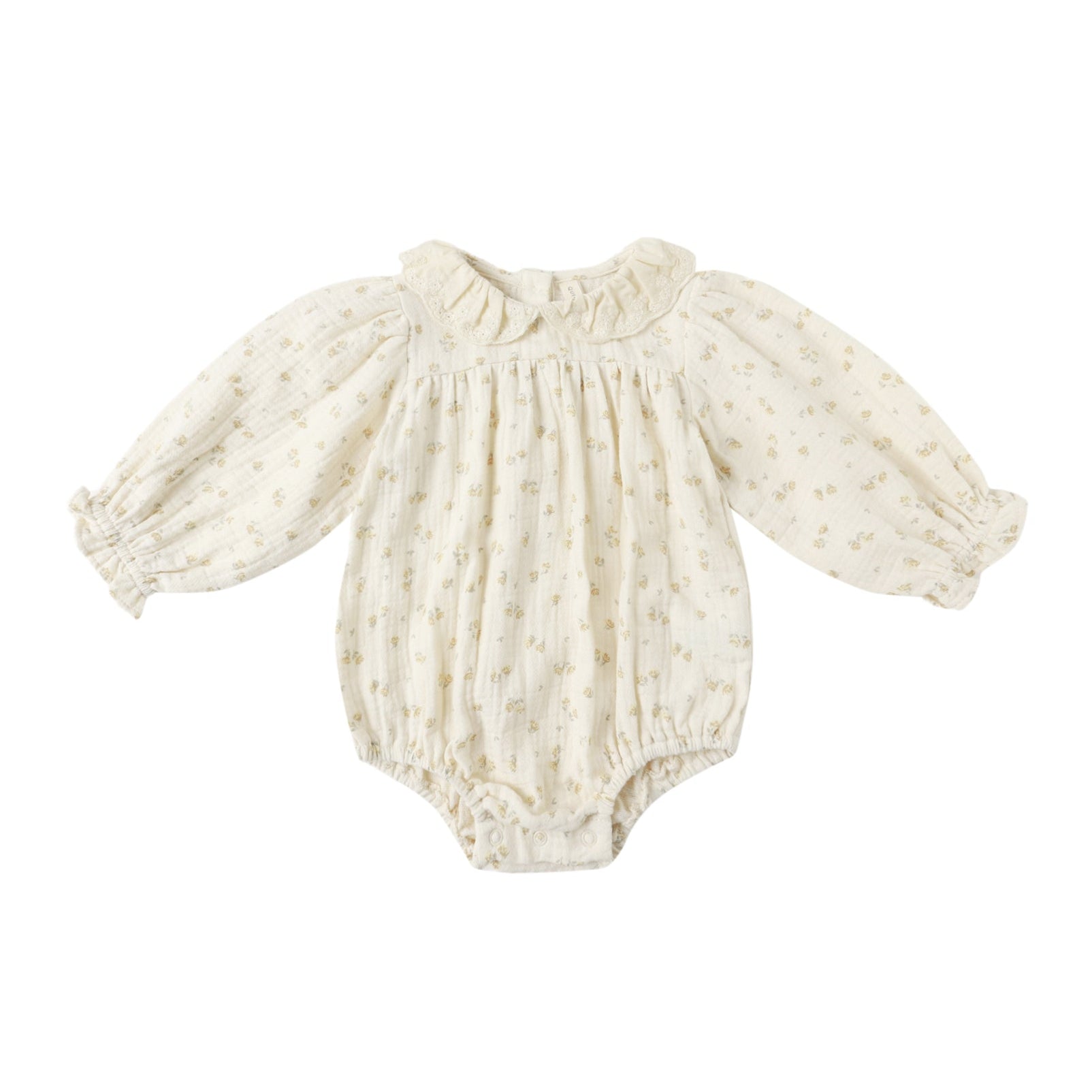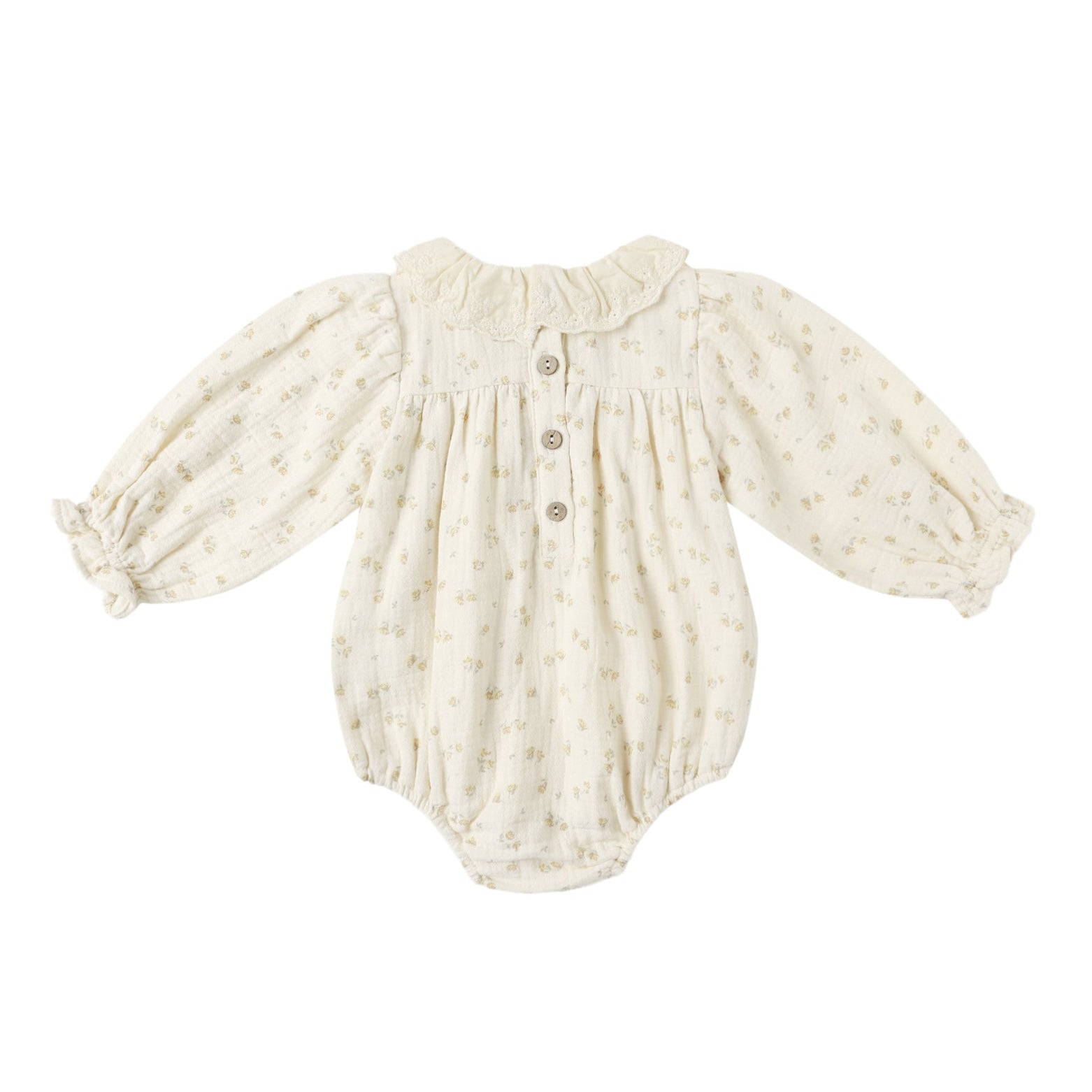 Our Callie Romper features a sweet embroidered collar, smocked front, and gathered long sleeves. Buttons at the back and snaps at the bottom make for easy dressing.