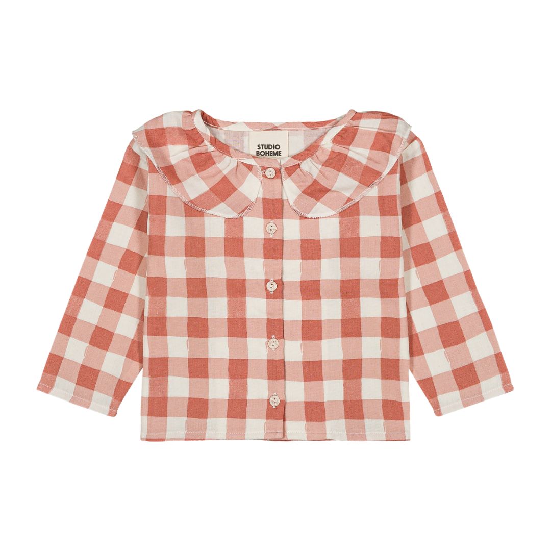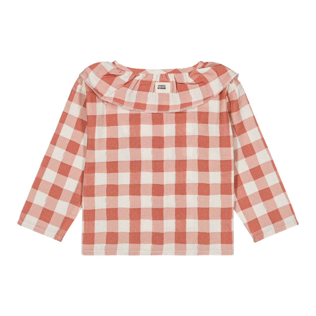 Long-sleeved, wide-neck blouse in organic cotton gauze. Fully buttoned with wooden buttons.